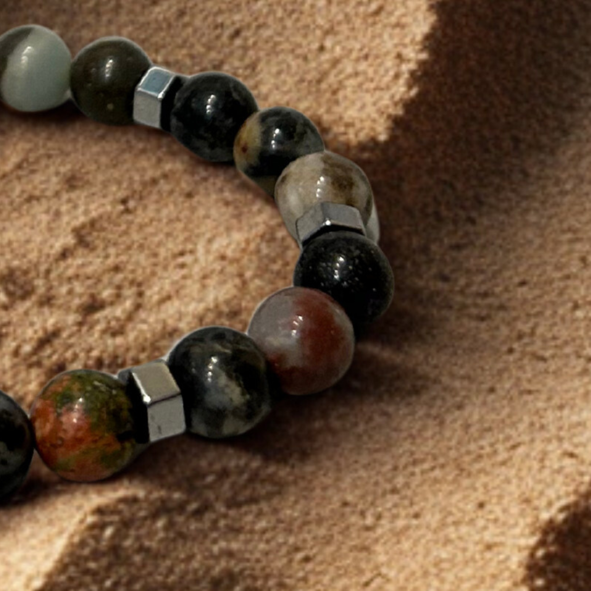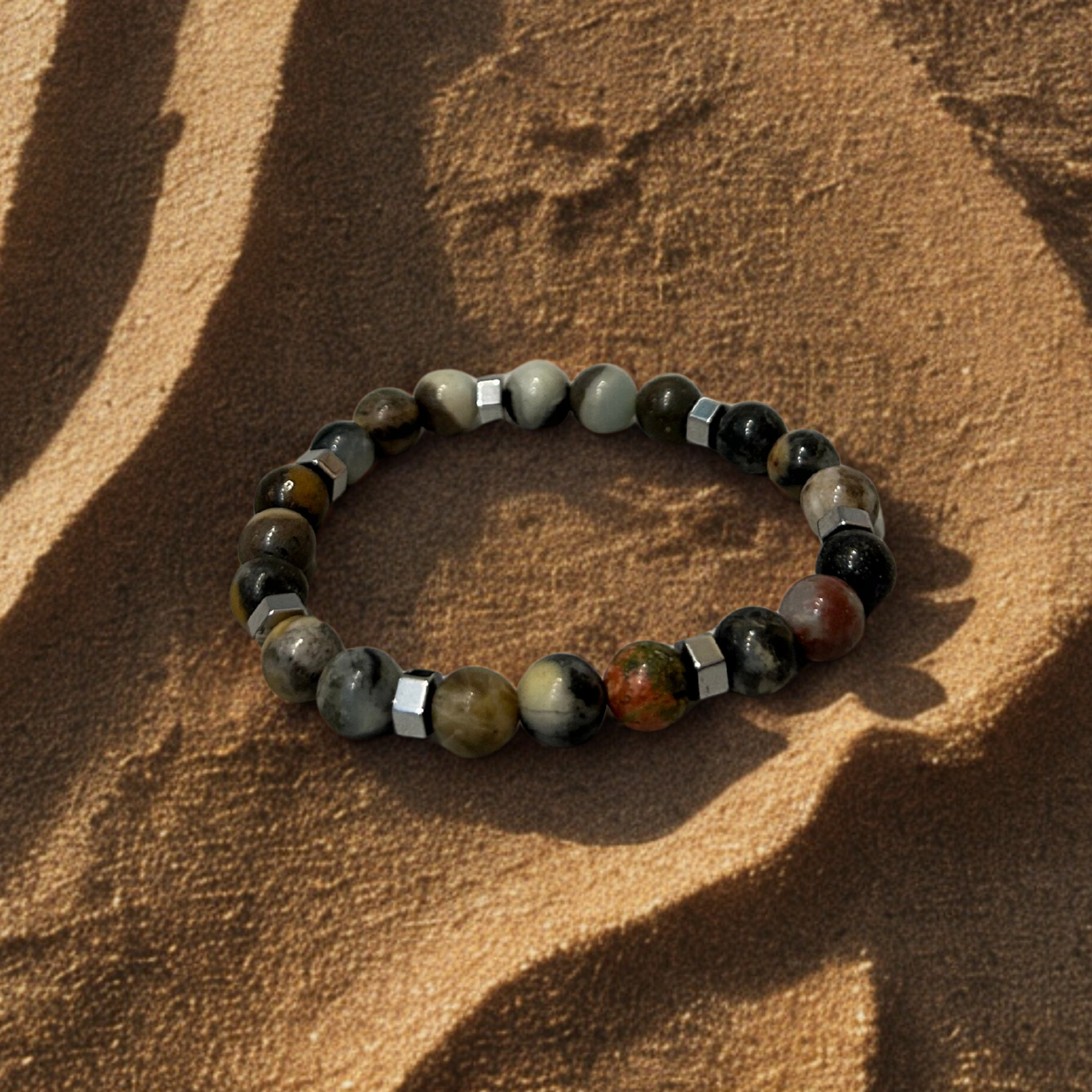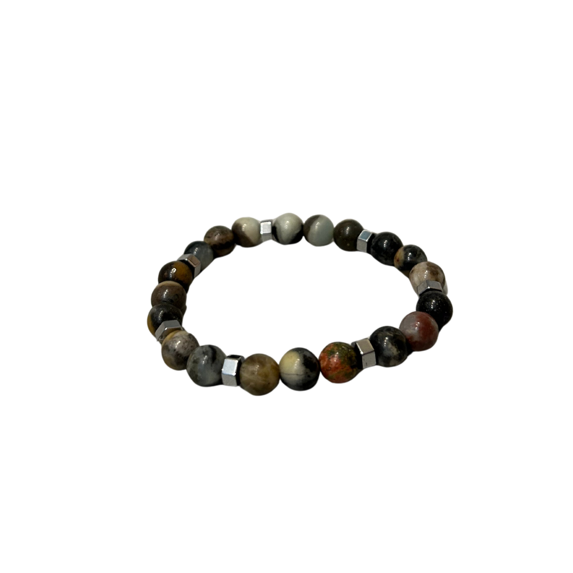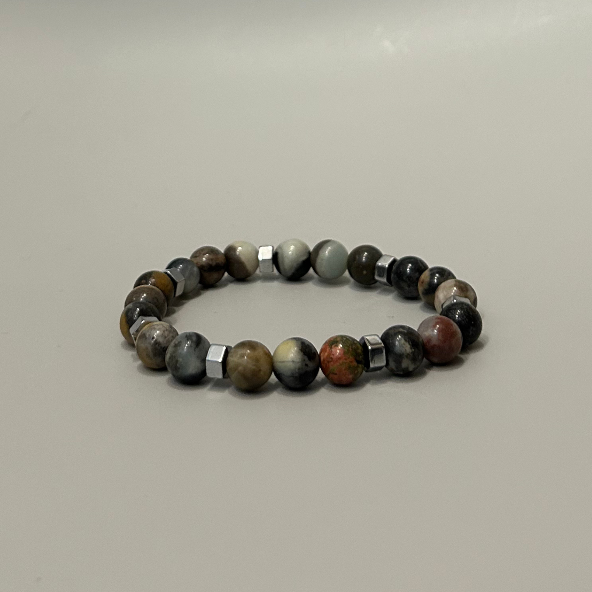 Χειροποίητο βραχιόλι με φυσικές πέτρες σε γήινες αποχρώσεις και διακριτικά μεταλλικά στοιχεία. Απλό και ευκολοφόρετο, φοριέται μόνο του ή σε συνδυασμό με άλλα βραχιόλια και ταιριάζει σε κάθε στιλ.