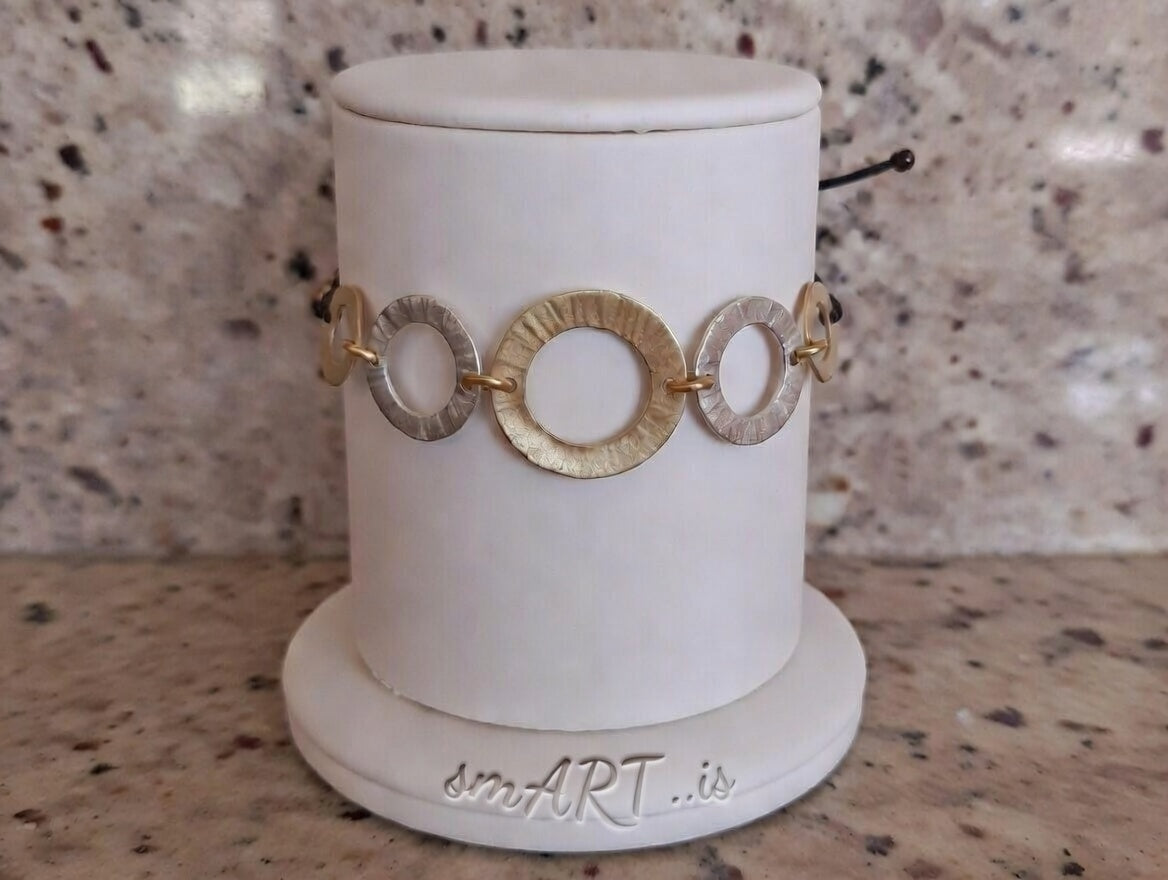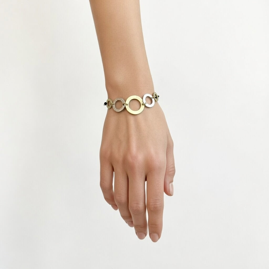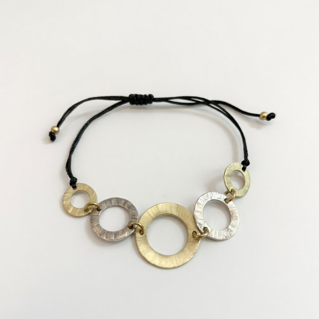 Μια σύνθεση σφυρήλατων κρίκων από ορείχαλκο, σε χρυσό και ασημί χρώμα, έγινε βραχιόλι. Το μαύρο κορδόνι στο τελείωμα προσθέτει δυναμισμό αλλά και την ευκολία της αυξομείωσης.