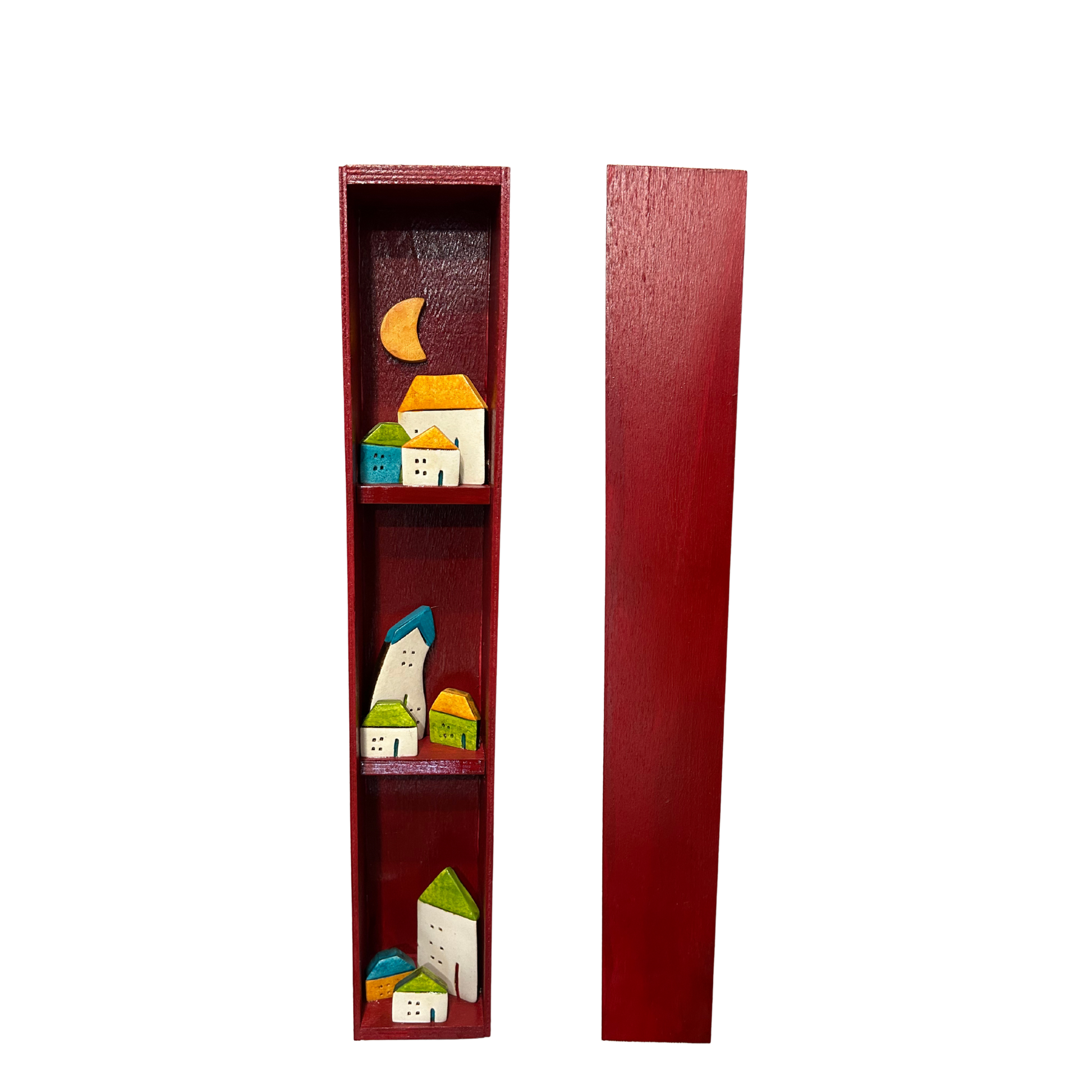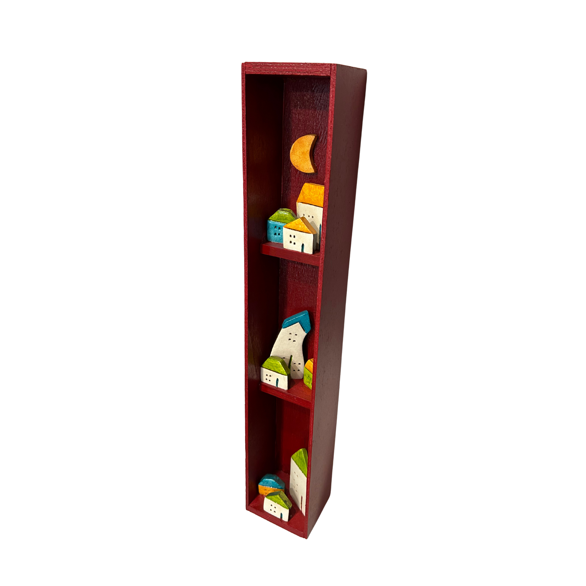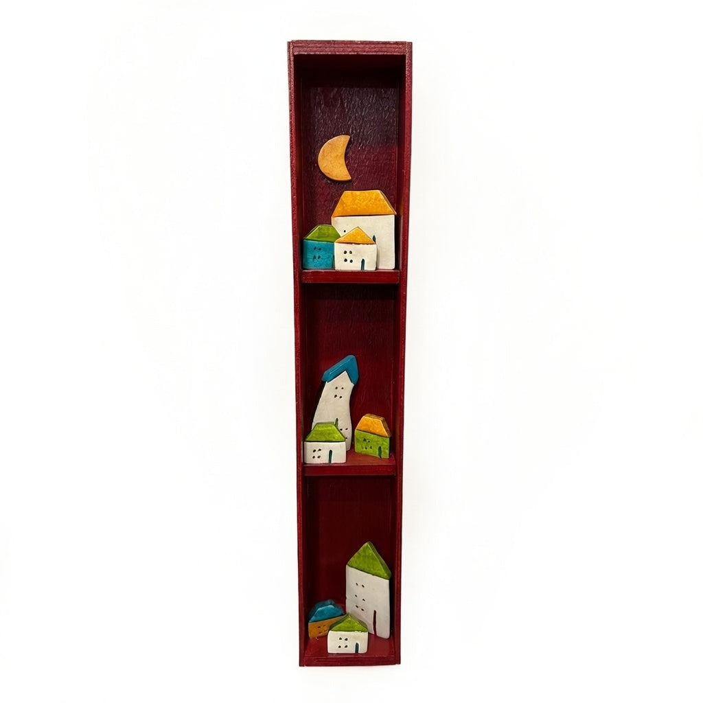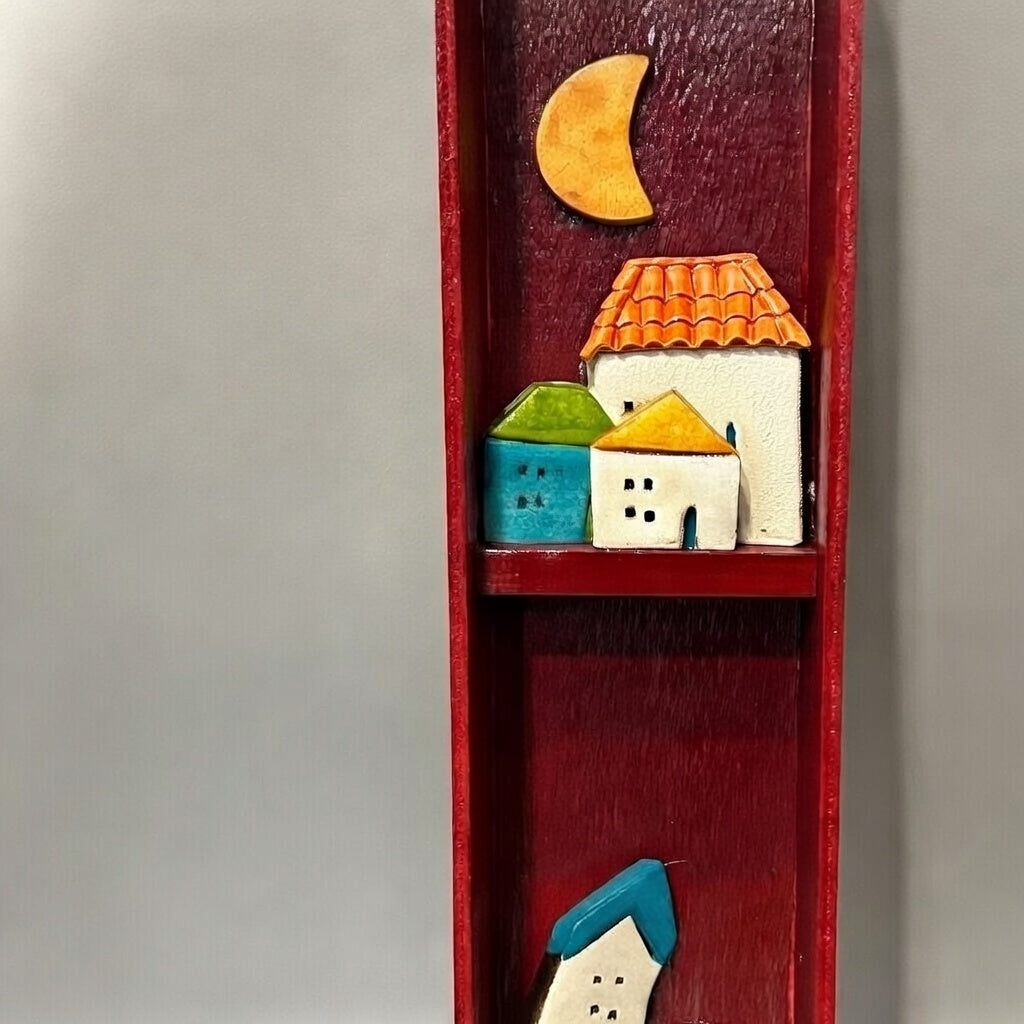 Χειροποίητη, κάθετη σύνθεση με κεραμικά σπιτάκια σε ξύλινη θήκη. Τα απλά σχήματα και τα έντονα χρώματα δημιουργούν ένα ήρεμο, ζεστό σύνολο που θυμίζει μικρό χωριό. Μια ιδιαίτερη επιλογή για να διασκοσμήσει τοίχο ή έπιπλο.