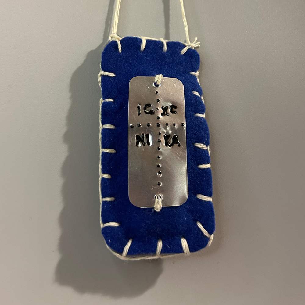 Χειροποίητο, ορθογώνιο, κρεμαστό φυλαχτό με μεταλλικό στοιχείο (εμπνευσμένο από το γνωστο Βυζαντινό Κωνσταντινάτο) σε μπλε χρώμα. Μια μοναδική δημιουργία για να χαριστεί ως δώρο σε νέο αυτοκίνητο ή νέο οδηγό!