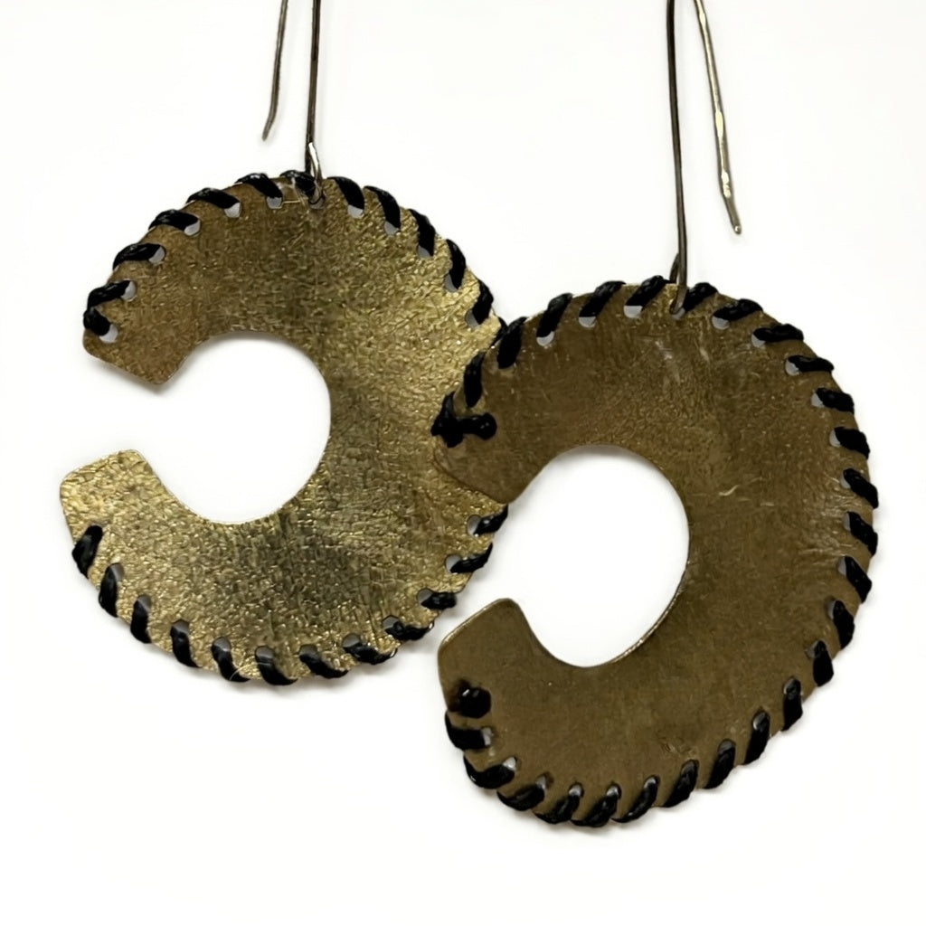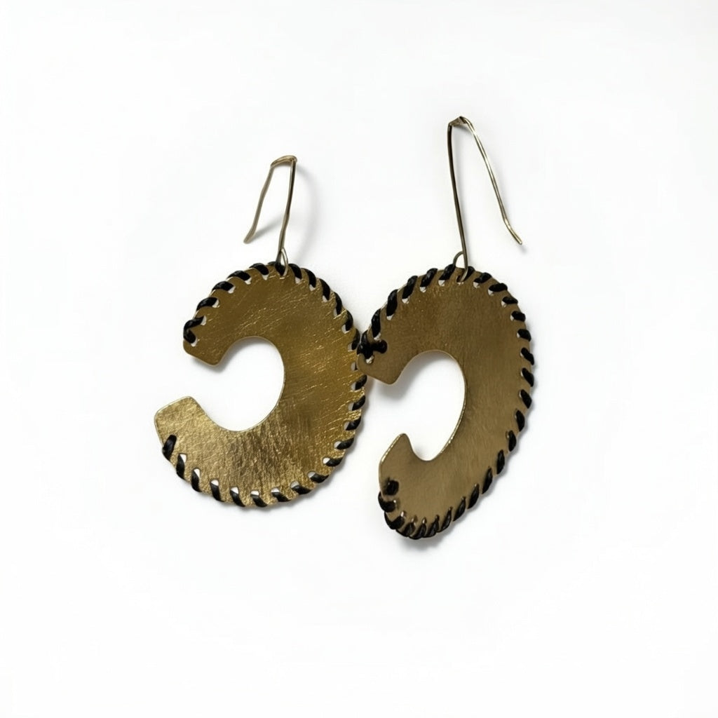 Χειροποίητα κρεμαστά σκουλαρίκια από ορείχαλκο με minimal, καμπυλωτό σχεδιασμό και πλέξιμο περιμετρικά. Άνετα, ιδανικά για καθημερινές αλλά και πιο ιδιαίτερες εμφανίσεις, προσθέτουν διακριτική κομψότητα και αφαιρετικό στιλ.